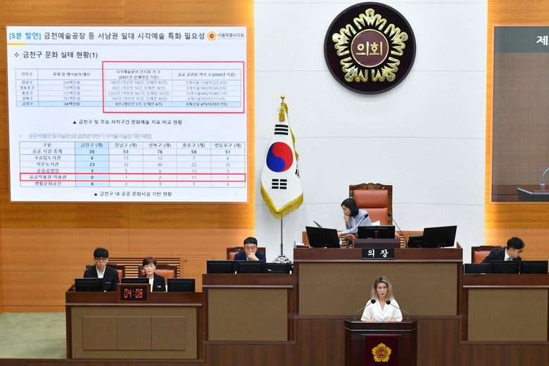 그리고, “2010년부터 운영 중인 금천예술공장과 올 하반기 건립되는 ’서서울미술관‘ 등 다양한 시설 간 협력을 비롯해, 서남권 일대의 특화된 시각예술을 위한 지속적 기관 간 연계를 통해, 시민 향유 중심의 문화정책이 금천에서도 반드시 실현되길 기대한다“며, 5분 발언을 마쳤다.