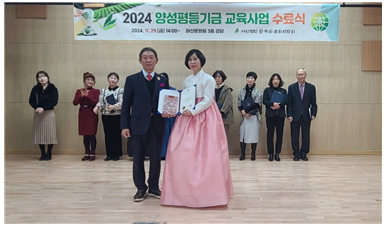 한편 2024년 양성평등 교육은 오영선 교육이사가 담임하였으며 수료자는(가나다순) 강윤주, 강진영, 곽경희, 김경란, 김난희, 김석곤, 배지윤, 심영제, 윤영화, 이다겸, 이미혜, 이수현, 이여원, 정경희, 조미정, 최덕자, 최숙자, 허정숙 교육생 등이다.