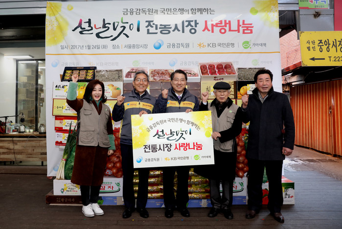 이날 서울중앙시장에는 진웅섭 금융감독원장, 윤종규 KB국민은행장, 기아대책 손봉호 이사장 및 홍보대사 김혜은씨가 함께 방문해 어려운 이웃에게 전달할 선물을 일일이 고르며 훈훈한 시간을 보냈다.