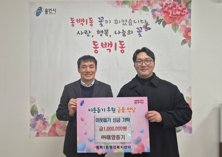 23일 기흥구 동백1동에는 ㈜태양중기가 어려운 이웃의 난방비 부담을 줄이는 데 사용해달라며 100만원을 기탁했다. 이 성금은 ㈜태양중기 임직원 12명이 자발적으로 모았다.