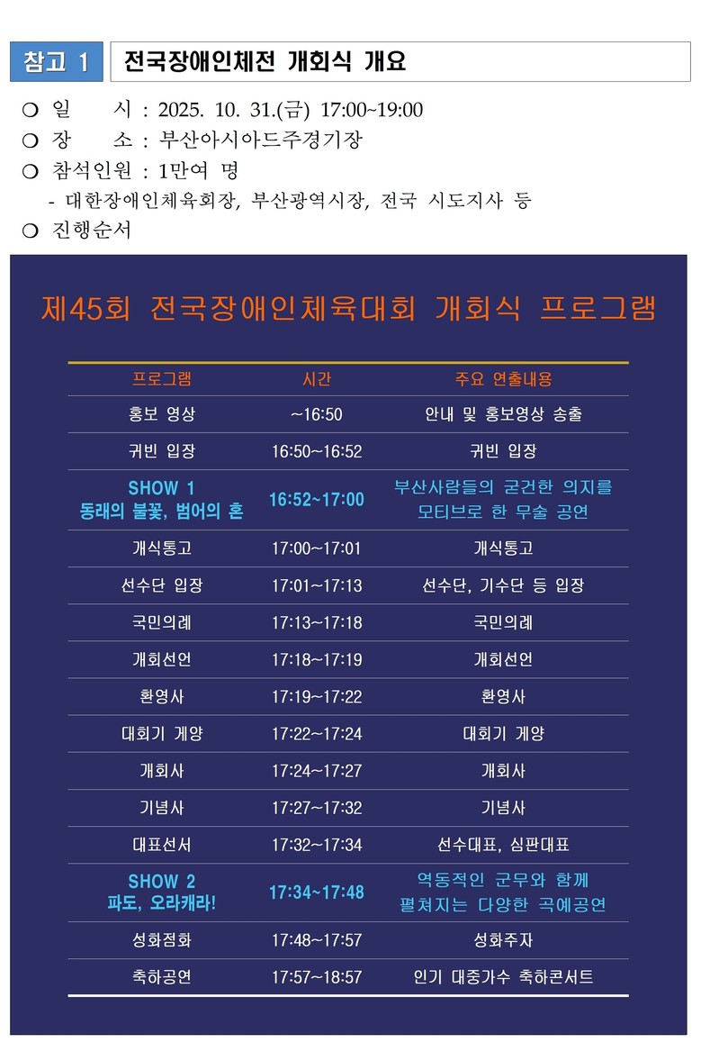 ◈ [쇼(Show) 1 동래의 불꽃, 범어의 혼!] 마샬아츠(Martial arts) 선수들과 댄서들의 합동 공연, 역사 속에서 굴복하지 않았던 부산의 기개와 투혼 연출, [쇼(Show) 2 파도, 오라캐라!] 비엠엑스(BMX), 파쿠르 [부산 세계타임즈=이용우 기자] 부산시(시장 박형준)는 25년 만에 부산에서 개최되는 「제45회 전국장애인체육대회」 개회식이 오는 10월 31일 저녁 5시에 부산아시아드주경기장에서 열린다고 밝혔다.