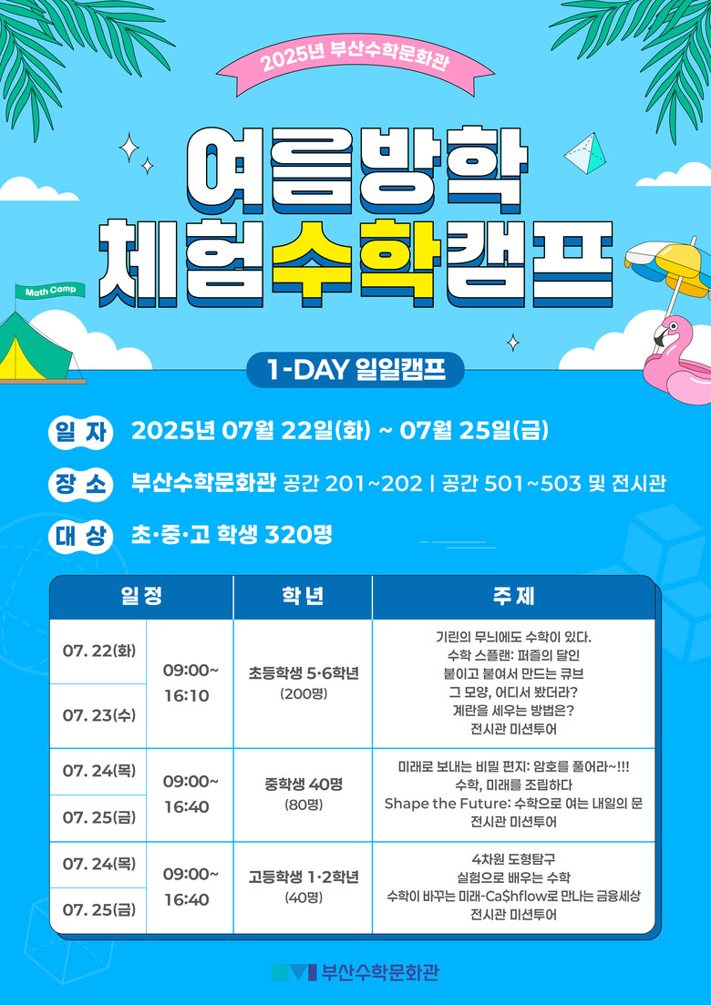 초등학교 5~6학년 학생들은 ‘기린의 무늬에도 수학이 있다’, ‘달걀을 세우는 방법’, ‘수학스플랜: 퍼즐의 달인’ 등 놀이와 체험을 통해 수학 개념을 탐구한다. 중학생은 ‘수학, 미래를 조립하다’와 ‘Shape the Future: 수학으로 여는 내일의 문’ 등 창의적인 사고를 유도하는 활동에 참여한다. 고등학생은 ‘수학이 바꾸는 미래: Ca$hflow로 만나는 금융세상’ 등 실생활에 밀접한 금융 수학을 주제로 활동한다. 모든 프로그램은 부산수학문화관의 전시관 미션투어와 함께 진행한다.