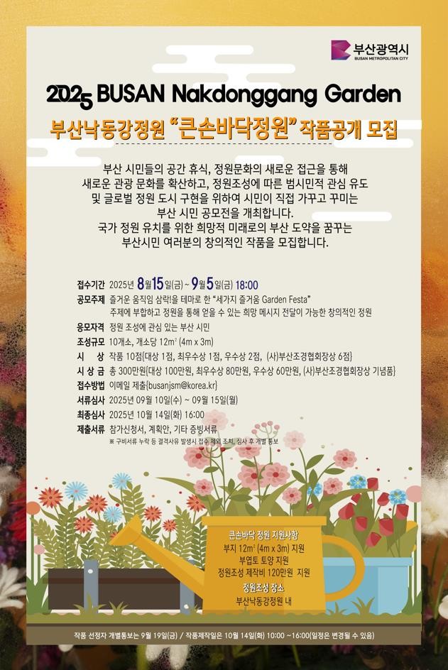 접수 기간은 8월 15일 오전 9시부터 9월 5일 오후 6시까지이며, 참가 신청서와 정원 조성 계획안 등의 제출 서류를 전자우편(busanjsm@korea.kr)으로 제출하면 된다.