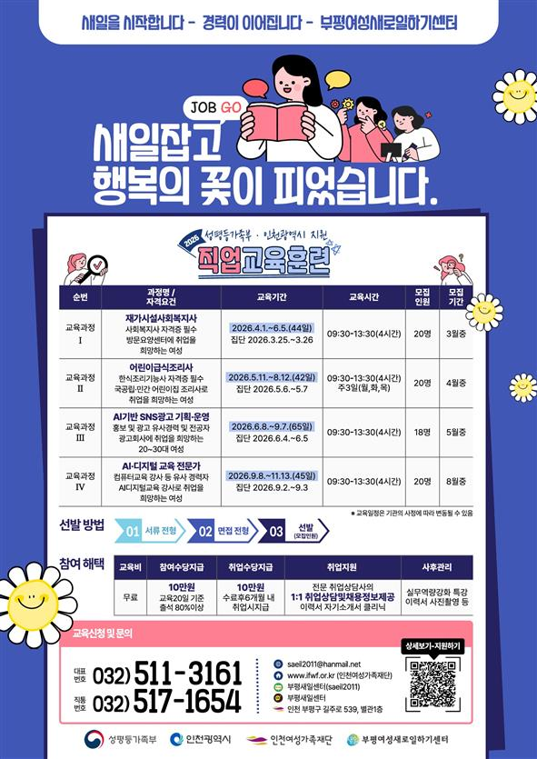 이번 직업교육훈련은 취업을 희망하는 여성들의 직무 역량을 강화하고 안정적인 일자리 진입을 지원하기 위해 마련된 과정으로, ▲재가시설 사회복지사 ▲어린이급식조리사, ▲AI기반 SNS광고 기획·운영 ▲AI·디지털 교육 전문가 분야 총 4개 과정으로 운영된다.
