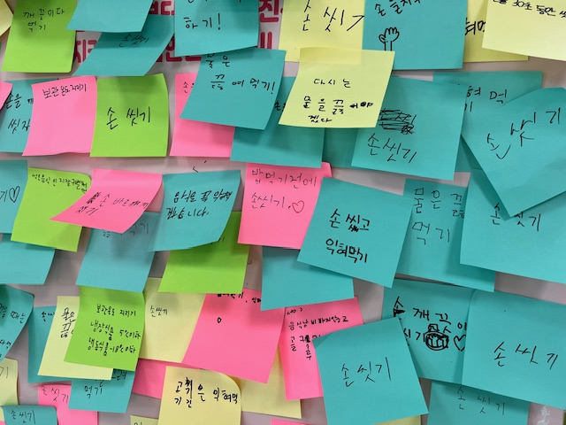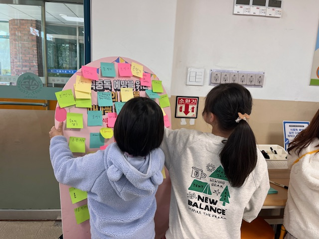 <식중독 예방 실천 다짐 메모지를 붙이는 학생>