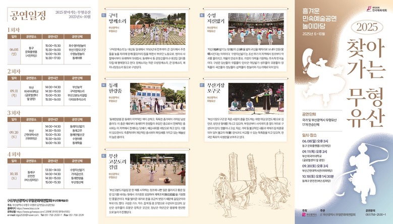 ◈ ▲동구 문화플랫폼 시민마당(6.8. 15:00) ▲부산외국어대학교 글로벌센터 앞 광장(9.11. 14:00) ▲부산근현대역사관 야외마당(9.20. 14:00) ▲동래구 온천천 버스킹마당(10.18. 13:30)… 공연은 무료 관람 가능 [부산 세계타임즈=이용우 기자] 부산시(시장 박형준)는 무형유산 전통 민속예술의 가치를 확산하고, 신명 나고 흥겨운 전통 민속예술 공연으로 시민들의 삶에 활력을 불어넣기 위해 「2025 찾아가는 무형유산」 '전통민속예술공연 놀이마당'을 개최한다고 밝혔다.