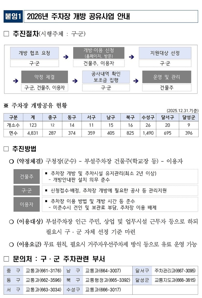 허준석 대구광역시 교통국장은 “공영주차장 조성에는 부지 확보 등 막대한 예산이 소요되는 한계가 있어, 이를 보완하기 위해 저비용·고효율의 ‘주차장 개방 공유사업’을 적극 추진하고 있다”며 “보다 많은 시설이 참여할 수 있도록 지속적인 홍보와 함께 시민 체감도가 높은 실효성 있는 운영에 더욱 힘쓰겠다”고 말했다.