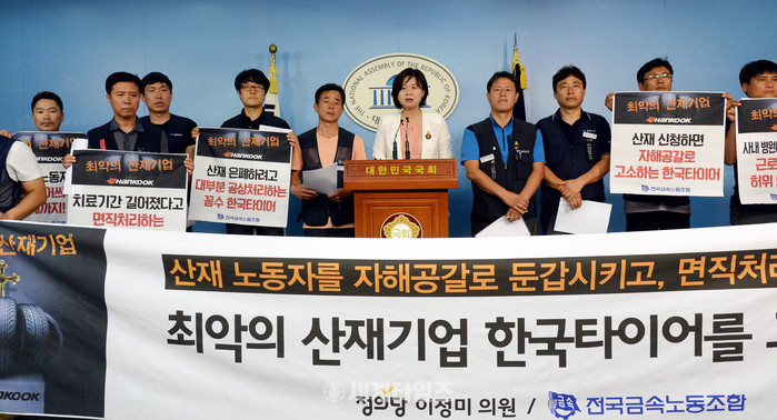 정의당 이정미 원내수석부대표와 금속노조가 8일 서울 여의도 국회 정론관에서 한국타이어에 대해 '산업재해 1등 기업'이라고 비판, "노동자들이 제대로 치료를 받고 건강하게 현장에서 일할 수 있도록 보장하라"는 기자회견을 하고 있다. 2016.08.08. 사진제공 뉴시스