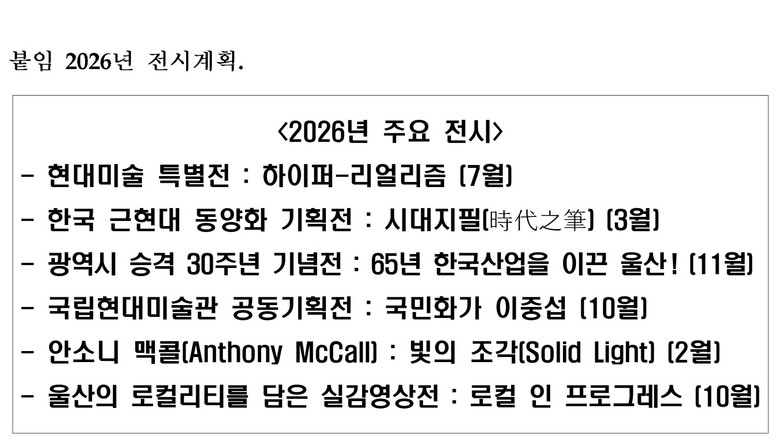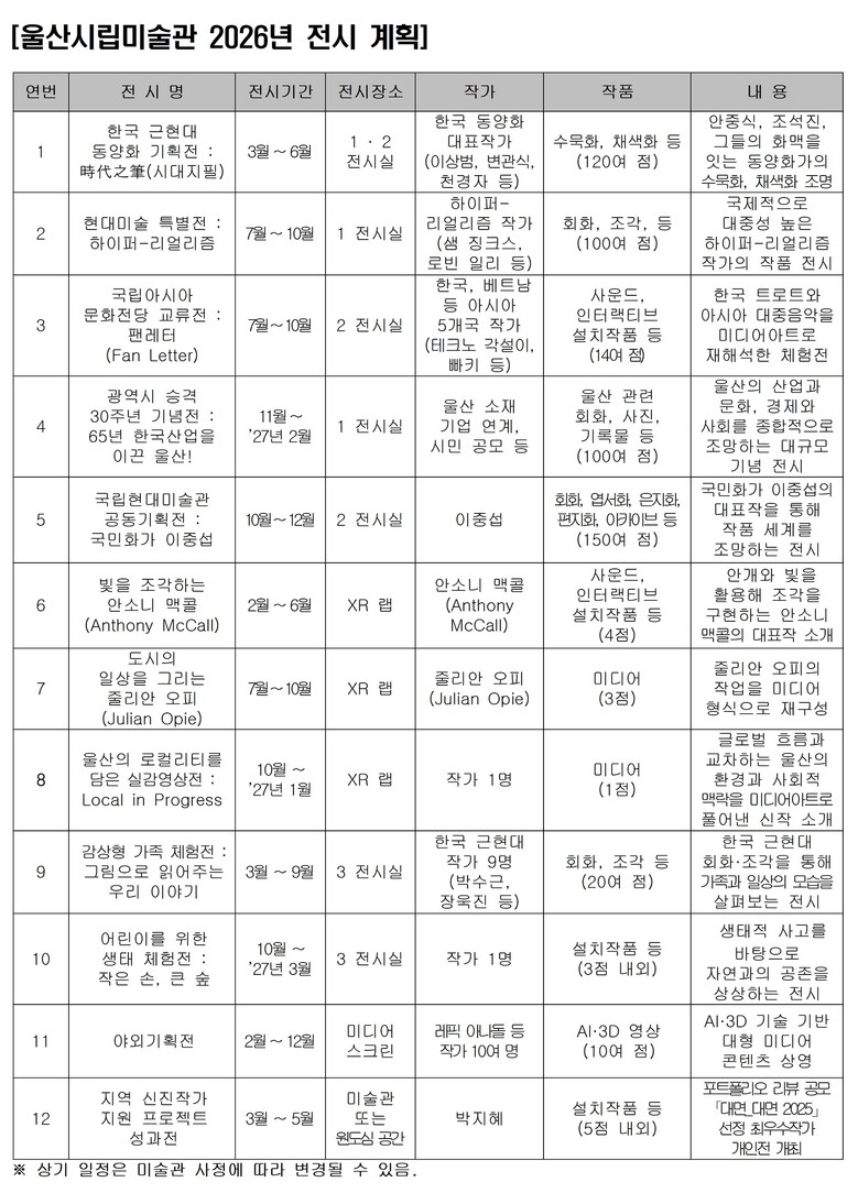 [울산 세계타임즈=이호근 기자] 울산시립미술관이 2025년 한 해 동안의 주요 운영 성과를 바탕으로 2026년 연간 전시 및 프로그램 운영 계획을 공개했다.