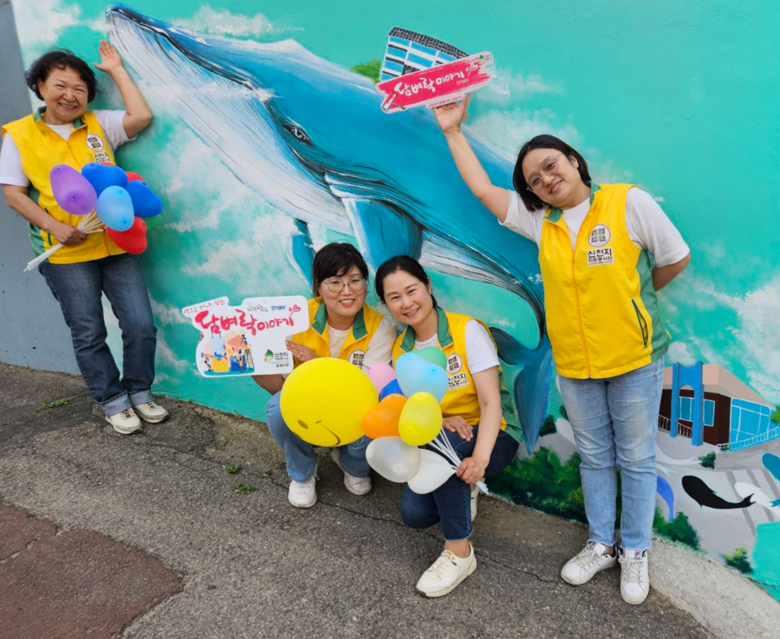 이번에 진행된 담벼락 이야기 주제는 꿈을 꾸는 고래로 각 가정마다 꿈꾸는 희망들이 이뤄지고 살기 좋은 동네가 되길 바라는 마음에 주민들과 협력해 벽화를 완성했다.