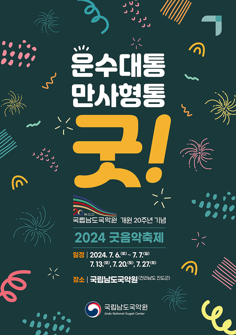특히, 올해는 국립남도국악원 개원 20주년을 기념하여 ‘운수대통, 만사형통 굿!’이라는 제목으로 다양한 공연과 학술회의, 부대행사 및 체험 등을 통해 함께하는 모든 분들의 건강과 안녕을 기원하고자 한다.