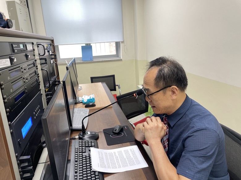 | ▲ 고운중 교사가 학생들에게 도서를 소개하는 방송을 하는 모습 |