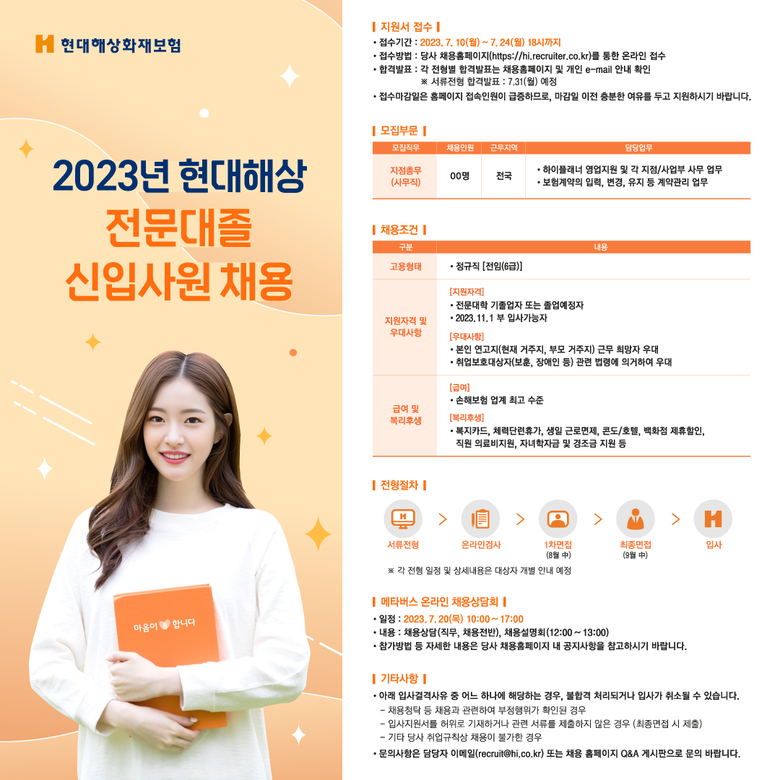 지원자격은 전문대학 졸업자 또는 졸업예정자로, 7월 24일(월) 18시까지 현대해상 채용홈페이지를 통해 지원할 수 있다. 지원자들은 서류전형 ▷ 온라인 검사 ▷ 1차면접 ▷ 최종면접의 전형을 거쳐 11월 1일 입사예정이다. 입사자들은 전국의 현대해상 지점에서 총무 역할을 맡게 된다.