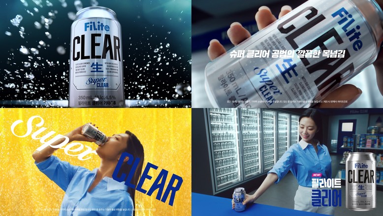 광고는 실버캔이 대지를 질주하는 장면으로 시작한다. 속도감에 캔의 외피가 벗겨지면서 ‘FiLite’ 로고가 모습을 드러내고, 도심과 터널을 빠르게 질주하여 편의점에 도착한다. 신선함을 상징하는 ‘生(생)’ 마크와, 최상의 깔끔한 목넘김을 표현한 ‘SUPER CLEAR’ 마크가 차례로 부착되고, 마지막으로 브랜드명인 ‘CLEAR’가 강렬하게 새겨지며 캔이 완성된다. 광고 후반에는 제품을 청량하게 마시는 모델과 함께, 제품 슬로건인 ‘슈퍼 클리어 공법으로 완성한 깔끔한 목넘김’이 나레이션과 자막을 통해 강조된다. 광고는 필라이트 클리어가 폭포수처럼 수직으로 강렬하게 떨어지는 장면으로 마무리되며, 시각적 쾌감과 함께 제품의 핵심 가치인 ‘깔끔한 목넘김’과 ‘청량감’을 직관적으로 전달한다.