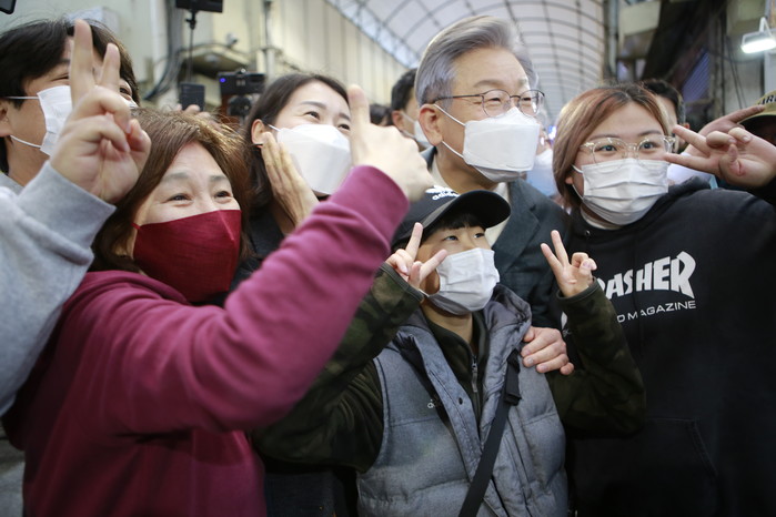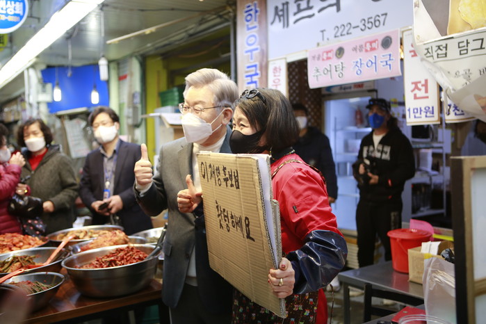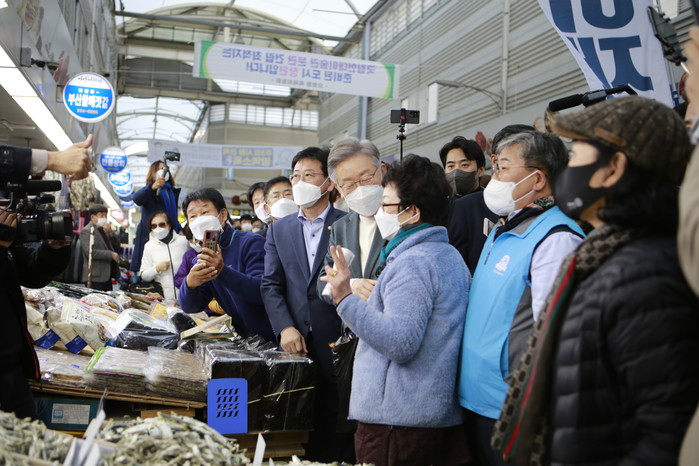 이 후보는 마산어시장에서 "골목이 살아야 나라가 산다"면서 지역경제 활성화를 강조했다. 시장에선 온누리상품권으로 직접 물건을 사고 상인들의 어려움을 청취했다.