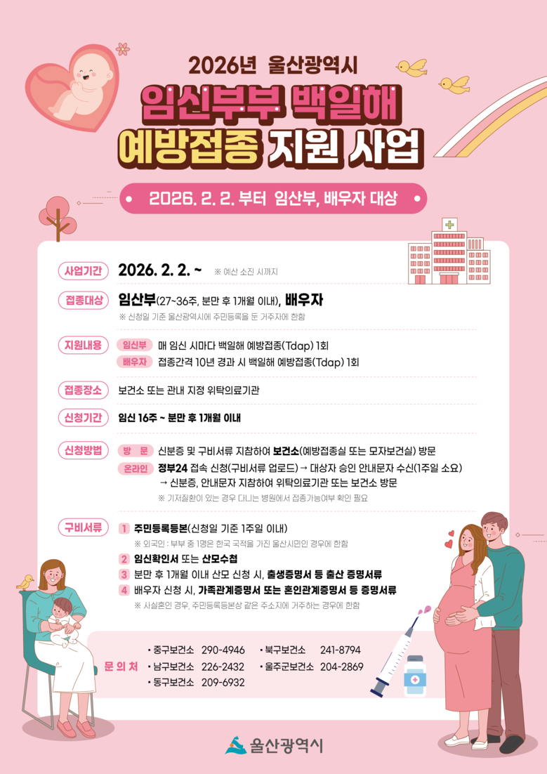 임산부(임신 27~36주 및 분만 1개월 이내), 배우자 대상 [울산 세계타임즈=이호근 기자] 울산시는 올해부터 임산부와 배우자를 대상으로 무료 백일해 예방접종 지원 사업을 시행한다고 밝혔다.