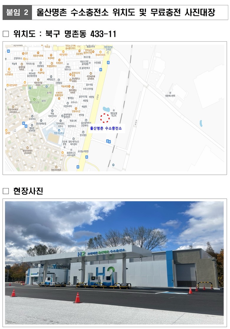울산명촌 수소충전소는 울산지역 17번째 수소충전소로 총 80억 원(국비 42억 원(환경부), 민자 38억 원)이 투입돼 조성됐다.
