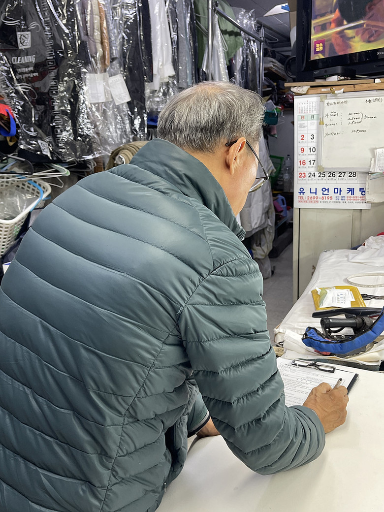 | ▲ 양천구 공중위생업소(세탁업) 영업주가 수기점검표를 작성하고 있는 모습 |