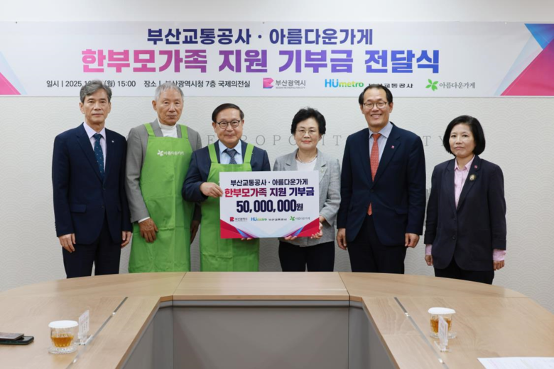 [부산 세계타임즈=이용우 기자] 부산시(시장 박형준)는 어제(13일) 오후 3시 시청 국제의전실에서 부산교통공사, 아름다운가게와 함께 저소득 한부모가족 지원을 위한 기부금 전달식을 개최했다고 밝혔다.