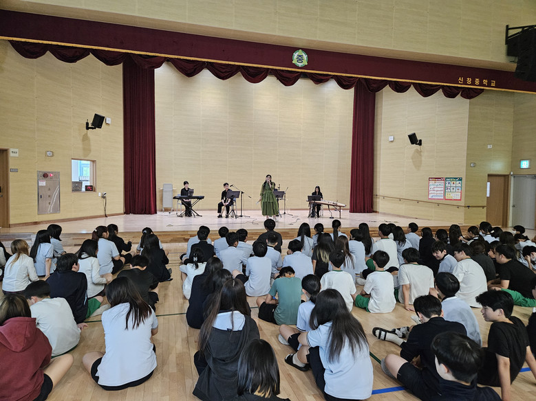 [아산시 세계타임즈=이현진 기자] 신창중학교(교장 백재흠)는 8월 28일(목) 신창중학교 강당인 신창관에서 1학년 학생들을 대상으로 ‘2025학년도 전통예술교육 국악 한마당’을 개최했다. 이번 행사는 고마국악관현악단을 초청해 가야금, 대금, 해금 등 우리 전통 악기의 다채로운 선율을 직접 체험하고 감상하는 시간으로 꾸며졌다.