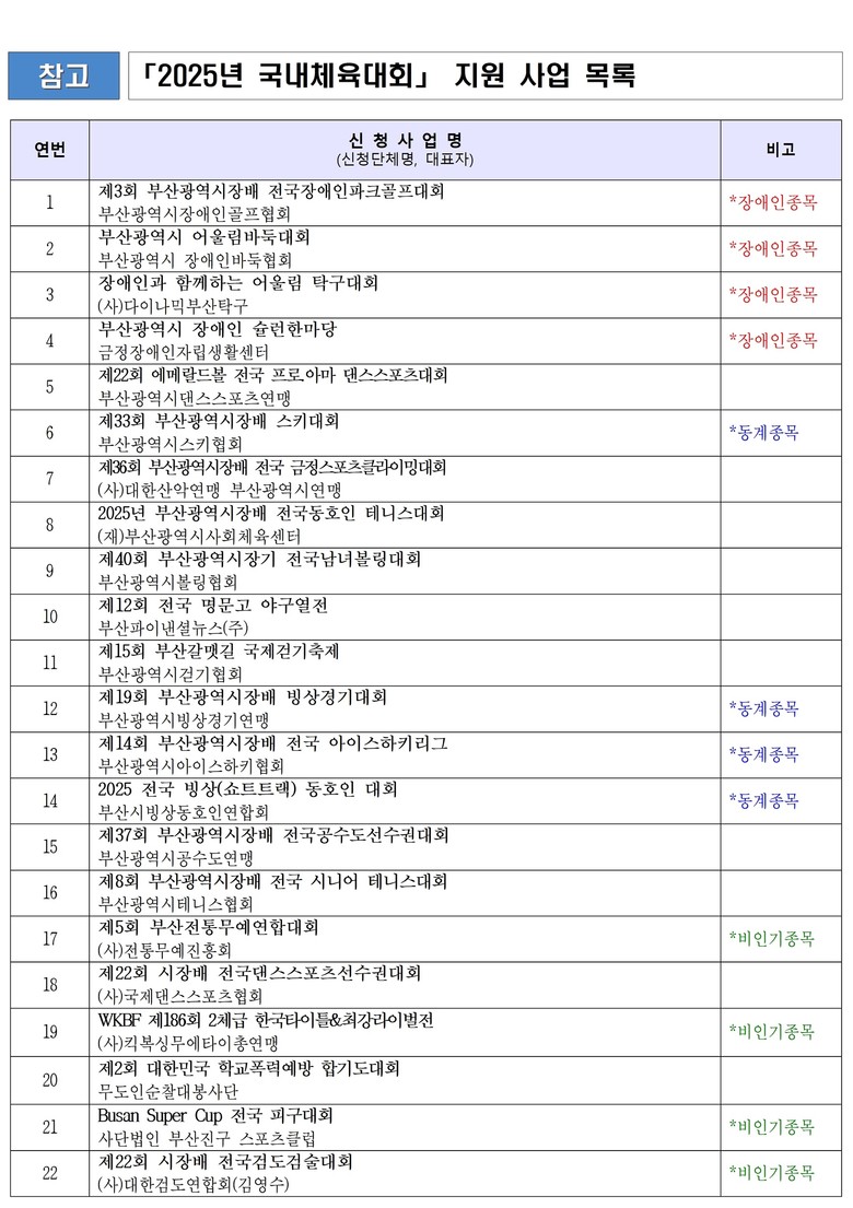 이번에 선정된 사업은 ▲제3회 부산광역시장배 전국장애인파크골프대회 ▲부산 슈퍼 컵(Busan Super Cup) 전국 피구대회 ▲제19회 부산광역시장배 빙상경기대회 등이며, 장애인 스포츠 활성화, 비인기 종목 육성, 동계 스포츠 기반 확대를 중심으로 사업을 선정했다.