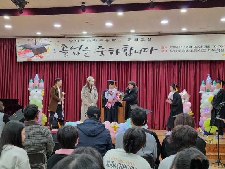 [남양주시 세계타임즈=송민수 기자] 남양주송라초등학교는 2024년 12월 30일, 학교 강당에서 특별한 졸업식을 개최하며 9명의 할머니 졸업생들에게 초등학교 졸업장을 수여했다. 이는 초등학력 인정 문해교육 프로그램을 통해 학업의 꿈을 실현한 뜻깊은 순간으로, 졸업식 현장은 감동으로 가득했다.