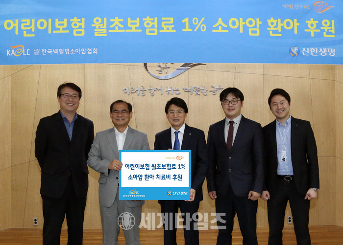 [세계타임즈 김장수 기자] 신한생명은 백혈병과 소아암으로 치료중인 환아를 돕기 위해 전년도에 판매한 어린이보험의 월납초회보험료 1%를 기금으로 조성한 치료비 후원금을 한국백혈병소아암협회에 전달했다고 9일 밝혔다.