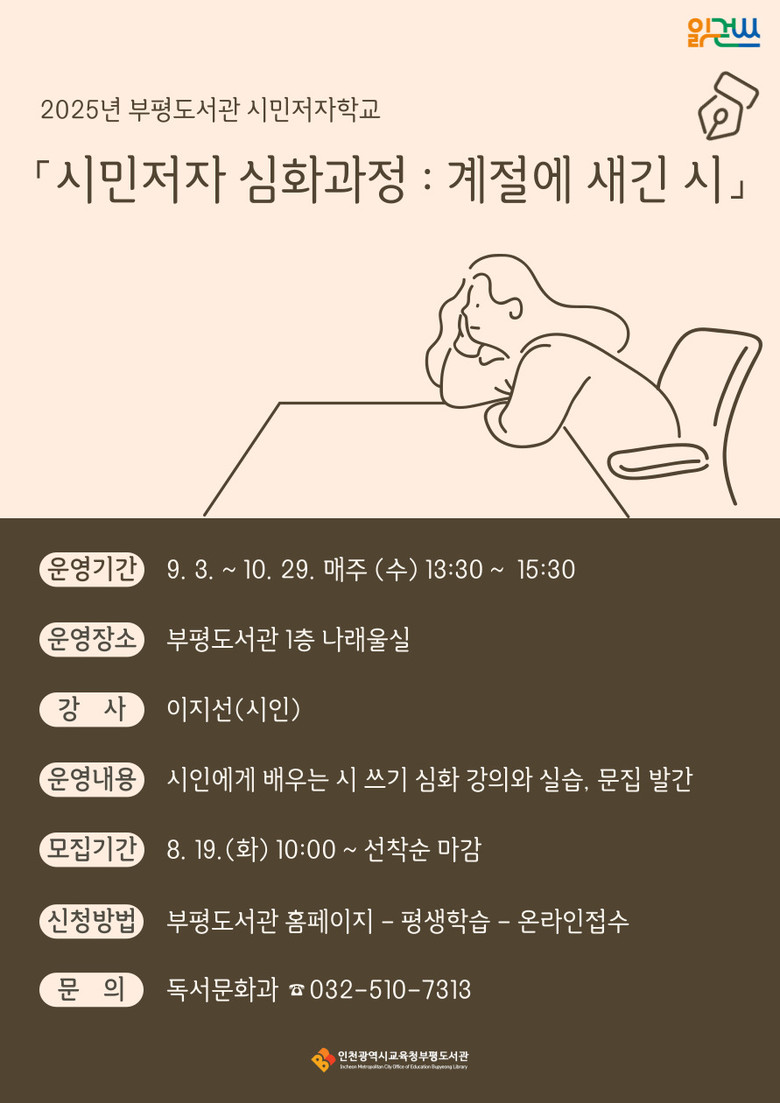 강의는 9월 3일부터 10월 29일까지 매주 수요일 오후 1시 30분에 8회에 걸쳐 진행하며, 신청은 8월 19일(화) 오전 10시부터 부평도서관 누리집에서 선착순으로 받는다.