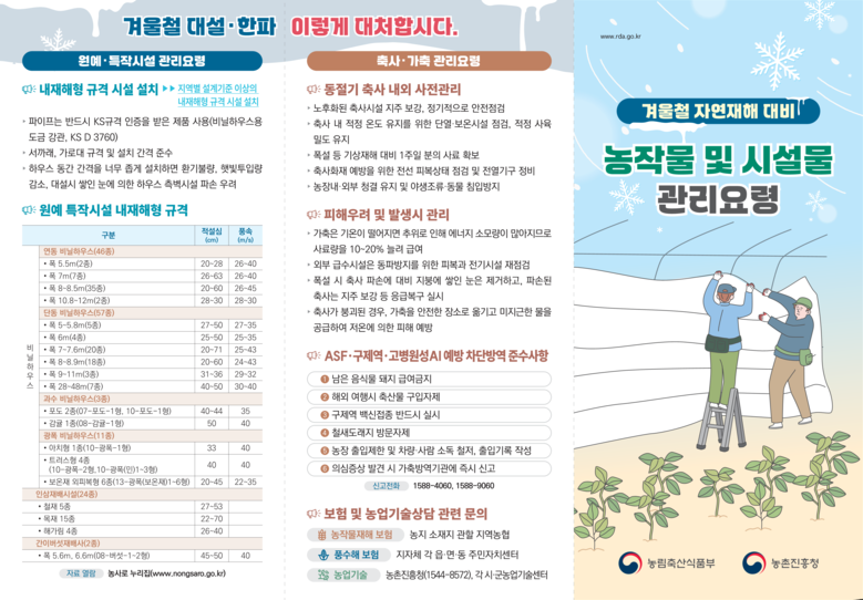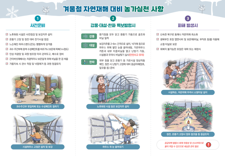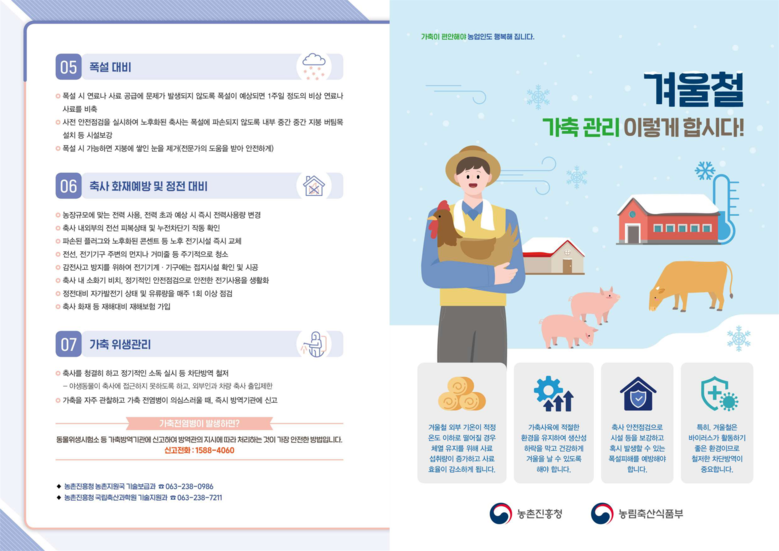 이밖에도 겨울철 재해 예방을 위한 가축관리, 시설물 관리요령, 전기화재 예방 리플릿을 배포하여 지속적인 피해예방 요령을 홍보할 예정이다.