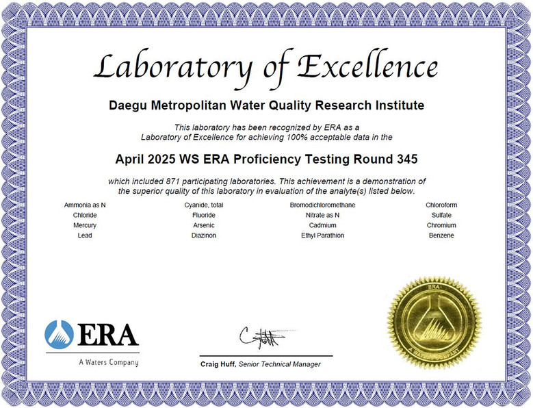 ▸ 정수장부터 수도꼭지까지 촘촘한 수질검사로 안전한 수돗물 공급 [대구 세계타임즈=한윤석 기자] 대구광역시 상수도사업본부 수질연구소는 2025년 미국환경자원협회(ERA, Environment Resource Associates)가 시행하는 국제숙련도 시험에 참가해 전 항목에서 모두 최고 등급인 ‘만족’ 판정으로 6년 연속 ‘최우수 분석기관’(Laboratory of Excellence)으로 인정받았다.