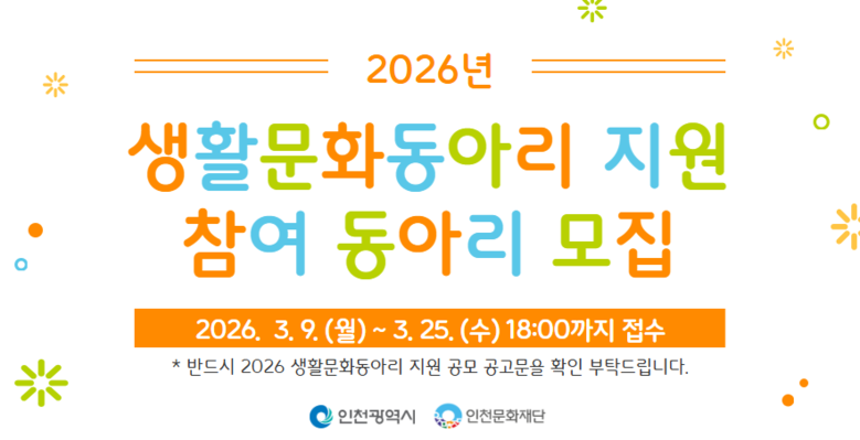○기초문화재단과의 협력을 통한 균형 있는 생활문화 지원 추진 [인천 세계타임즈=심하린 기자] 인천광역시(시장 유정복)와 인천문화재단(대표이사 이종관)은 인천 시민들의 자발적인 문화예술 활동을 지원하기 위해 「2026 생활문화동아리 지원」 사업을 추진한다.