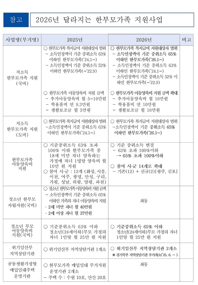 아울러 매입임대주택 30호를 통해 기준 중위소득 100%이하(2인가구 월 419만 원) 무주택 한부모 가족의 안정적인 주거 환경을 지원할 계획이다. 문의는 수원 고운뜰(031-216-9004), 안산건강가정지원센터(031-501-0033)에서 가능하다.