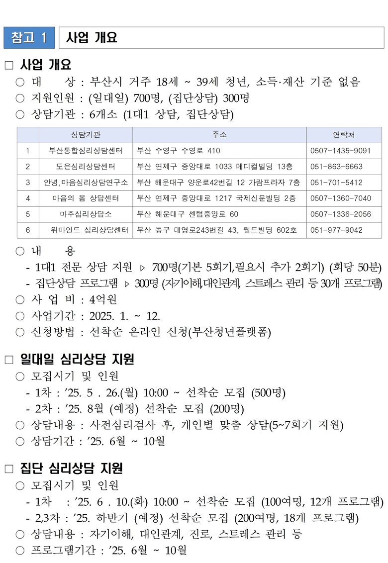 「일대일 심리상담」은 1차 500명, 2차 200명을 모집한다. 1차 참여자는 오는 5월 26일 오전 10시부터 부산청년플랫폼을 통해 선착순으로 모집하며, 2차는 8월 중 모집할 예정이다.