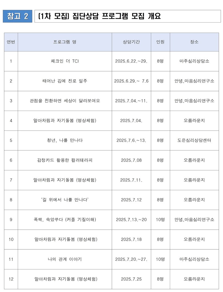 「집단 심리상담 프로그램」은 자기 이해, 대인관계, 스트레스 관리 등을 주제로 운영되며, 각 프로그램당 참여 인원은 8명 내외다. 지난해 18개 프로그램, 164명 지원에서 올해는 30개 프로그램, 300여 명으로 확대해 지원한다.