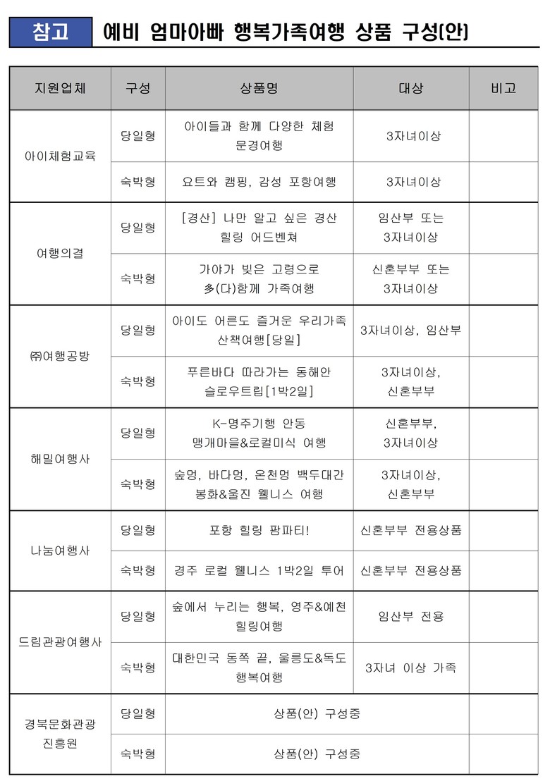 여행은 당일형(20만원 상당)과 숙박형(1박2일/30만원 상당) 두 가지 유형으로 구성되며, 경북의 자연·미식·명상·액티비티 등 다양한 웰니스 콘텐츠를 중심으로 신혼부부·임신 부부 등 참여자의 특성에 맞게 맞춤형으로 기획되었다.