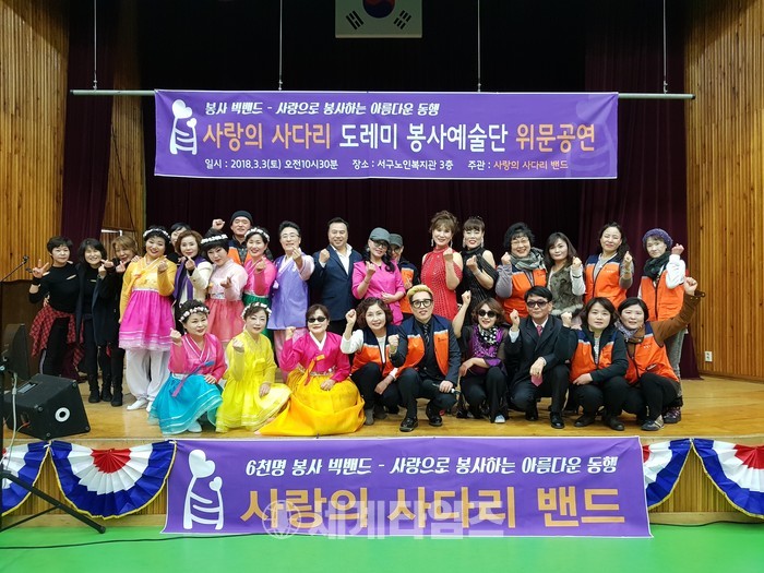 [대전=세계타임즈 이장성 기자] 다양한 봉사를 하고 있는 SNS 6천명 봉사단체 사랑의 사다리 밴드(리더 이정제)의 도레미봉사예술단(단장 안경헌)은 3일 오전10시부터 서구노인복지관에서 100여명의 어르신들께 위문공연봉사로 사회적효행을 실천하였다