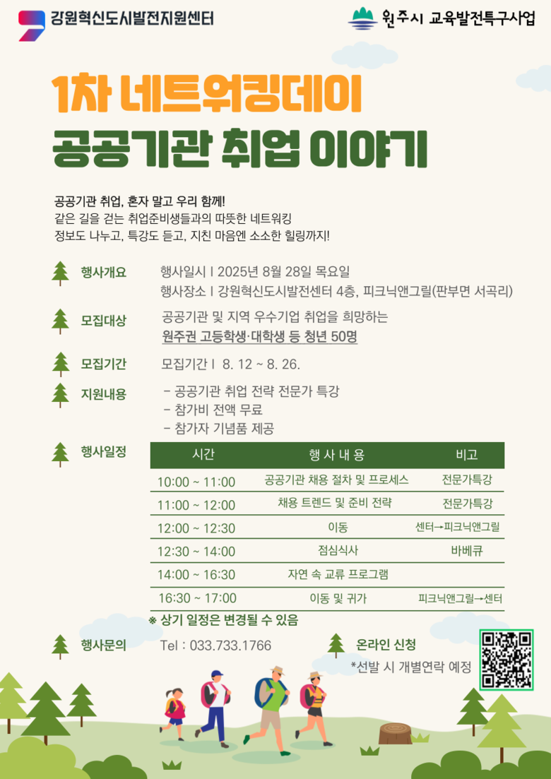 이번 프로그램은 공공기관 및 지역 우수기업 취업을 희망하는 원주권 고등학생·대학생 등 청년들을 대상으로 강원혁신도시발전지원센터와 자연체험공간 ‘피크닉앤그릴’에서 오전 10시부터 오후 5시까지 진행되며, 청년들의 공공기관 취업 역량 강화와 심리적 재충전을 목표로 마련되었다.