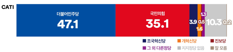 이념 성향별로는, 진보층과 중도층에서 ‘더불어민주당’이 우세, 보수층에서는 ‘국민의힘’이 강세를 보였다. 중도층은 ‘더불어민주당’(53.1%)이 ‘국민의힘’(25.3%)보다 27.8%p 앞섰으며, ‘조국혁신당’은 5.1%의 지지율을 기록했다.