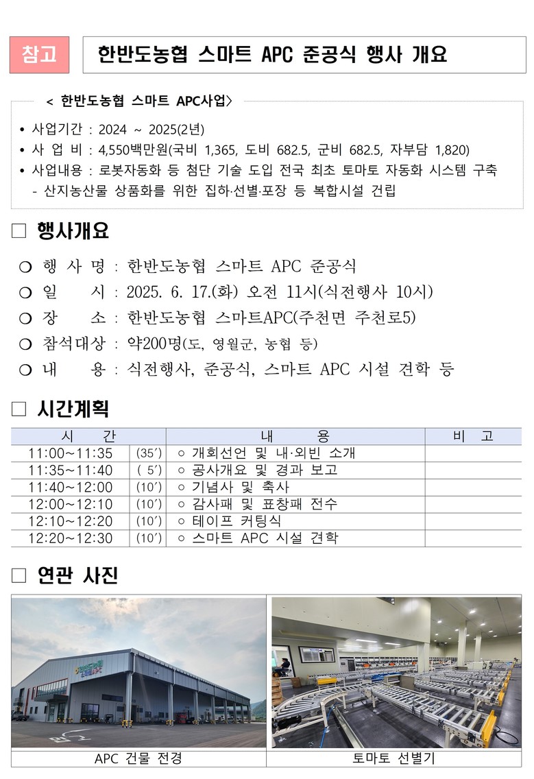 - 농가와 소비자 모두 혜택을 체감할 수 있는 농업혁신 플랫폼 기대 [강원도 세계타임즈=김민석 기자] 강원특별자치도(도지사 김진태)는 6월 17일(화), 영월군 주천면에서 「한반도농협 스마트 APC 사업 준공식」을 개최하고, 지역 농업의 미래를 선도할 첨단 거점시설을 본격 가동한다고 밝혔다.
