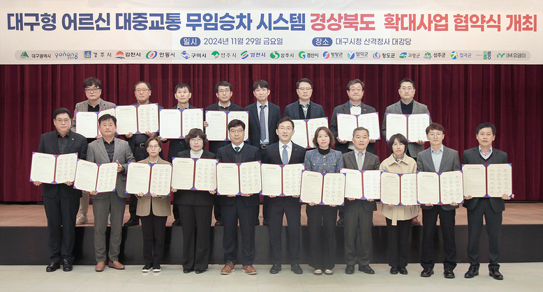 [대구 세계타임즈=한윤석 기자] 대구광역시는 11월 29일(금) 오전 11시 대구시청 산격청사 대강당에서 경상북도 포항시, 경주시 등 16개 기초 지자체와 함께 대구형 어르신 무임승차 시스템 확대 구축을 위한 업무협약을 체결했다.