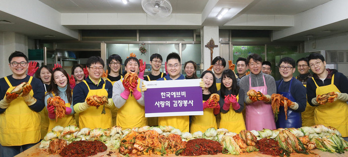 한국애브비(대표이사 유홍기)는 6일 서울 영등포구 요셉의원과 성북구 정릉동에서 전직원이 참여한 가운데 ‘사랑의 김장 나눔 및 연탄배달’ 봉사로 연말 이웃 사랑을 실천했다. 이날 소외 이웃들의 월동 준비를 돕고자 김장 350포기와 3800장 연탄배달을 통해 1000만원 규모의 성금도 전달했다.