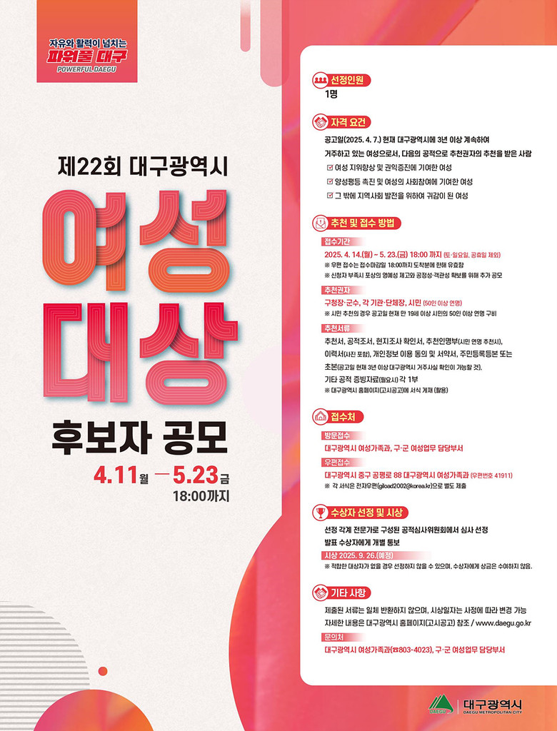 수상 자격은 공고일 현재(4.7.) 대구광역시에 3년 이상 계속하여 거주하면서, ▲여성 지위향상 및 권익증진에 공헌, ▲양성평등 촉진 및 여성의 사회참여에 기여, ▲그 밖에 지역사회 발전을 위하여 귀감이 되는 여성으로, 구청장·군수, 기관·단체장, 또는 시민 50명 이상 추천을 받아 대구광역시 혹은 구·군 접수처로 관련 서류를 제출하면 된다.