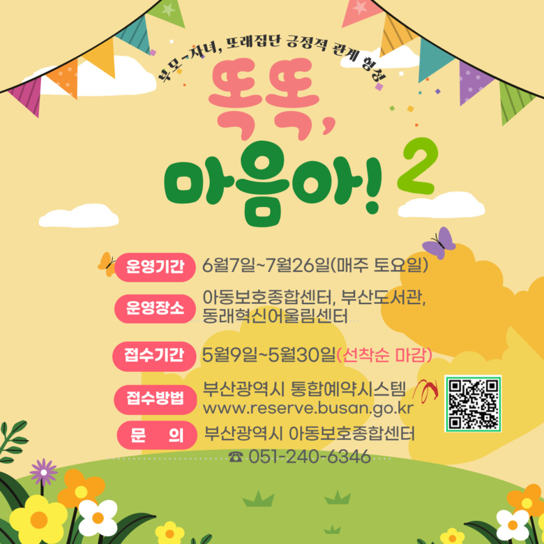 ◈ 5.30.까지 시 통합예약시스템을 통해 선착순 접수로 참여 가능, 참가비 무료 [부산 세계타임즈=이용우 기자] 부산시 아동보호종합센터(이하 센터)는 또래 관계 간 사회성 향상, 부모-자녀 간 의사소통과 상호작용 증진을 위해 오는 6월 7일부터 7월 26일까지 제2차 집단심리 프로그램 「똑똑, 마음아!(이하 프로그램)」를 운영한다고 밝혔다.