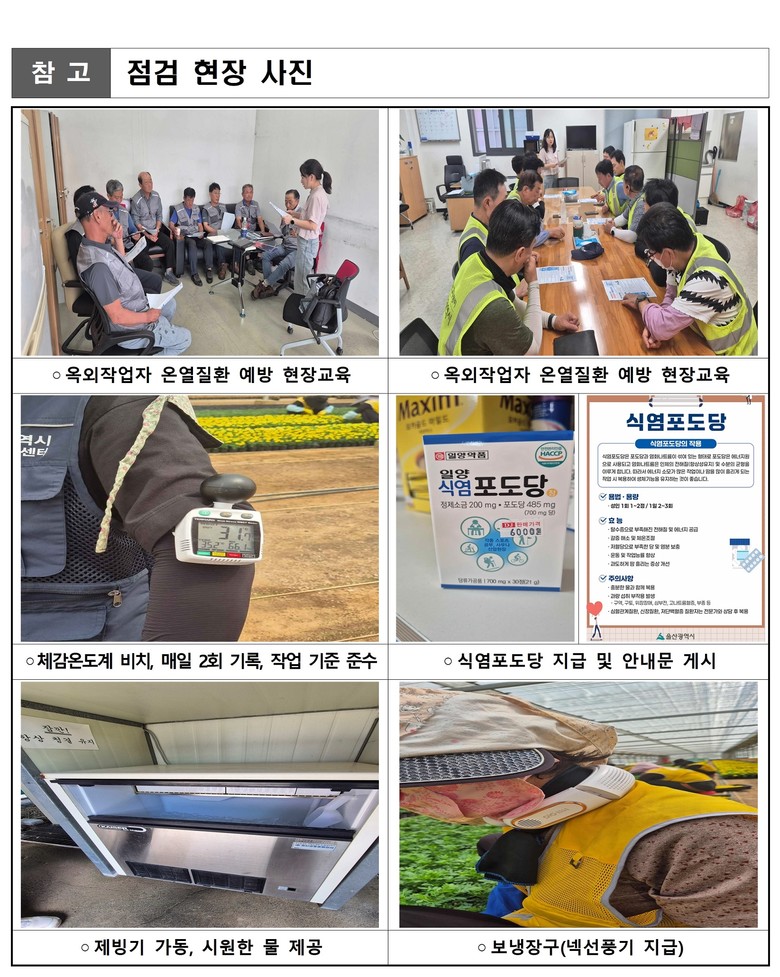 주요 점검항목은 △폭염대비 5대 기본수칙(물, 그늘·휴식, 보냉장구, 응급조치) 이행 여부 △체감온도 측정·기록 및 휴식 기준 적용 △작업시간 조정 기준 준수 △온열질환 예방 교육 및 응급처치 등이다.