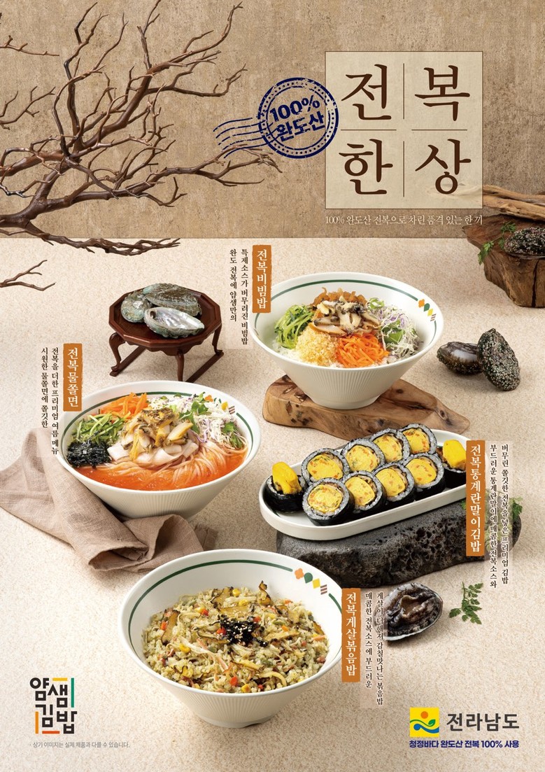 이번에 얌샘 김밥에서 출시 예정인 메뉴는 전복계란말이김밥·전복비빔밥·전복게살볶음밥·전복물쫄면 총 4종이다. 100% 전남의 살아있는 전복만을 사용하며, 소비자 선호에 맞춰 연구와 테스트를 통해 메뉴를 개발했다.