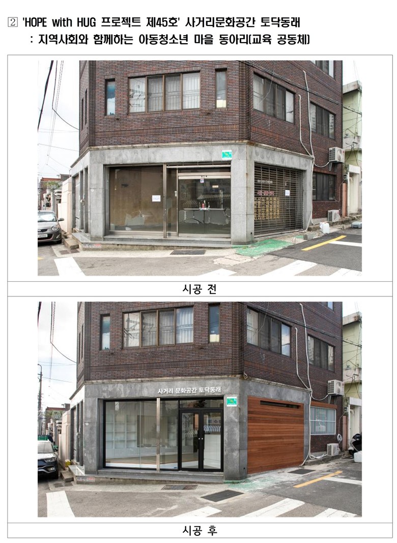 이 사업은 지역건축계의 설계 재능과 공사 재원을 기부받아 사회적 약자를 위한 노후 공익시설의 공간 환경을 개선하는 민관협력 공간복지 사업이다. 2013년부터 추진돼 지난해(2024년)까지 총 61건의 시설 개선을 완료하며 지역사회에 따뜻한 변화를 만들었다.