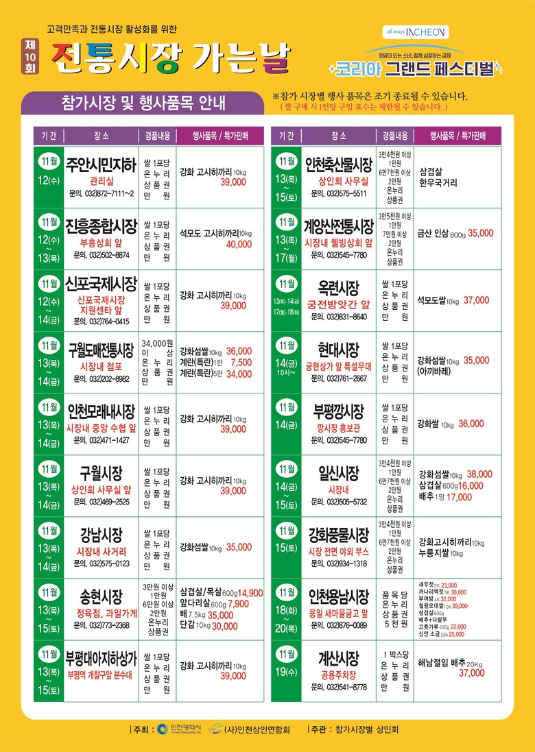 이번 행사는 (사)인천상인연합회(회장 서장열)가 주최하고 인천광역시(시장 유정복)가 후원하며 ‘인천 세일페스타’ 시기에 맞춰 관내 18개 전통시장에서 진행된다.