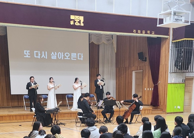 | ▲ 광주시교육청이 2일 각화중학교에서 ‘학교로 찾아가는 5·18 문화예술공연’을 개최하고 앞으로 5월 동안 7개 학교를 방문해 공연할 예정이다. 공연은 ‘빛이여! 빛이여! 빛고을이여!!’를 공연명으로 전문 공연단체 ‘온챔버오케스트라’가 참여한 가운데 관현악, 합창, 독창, 해설, 문학이 어울려진 창작 오라토리오로 진행된다. / 제공 광주광역시교육청 |