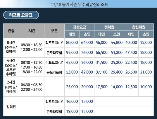 무주덕유산리조트는 지난해보다 일주일정도 빠른 11월 25일 중급 루키힐 슬로프로 17/18 스키시즌을 개장한데 이어 지난 주말 초급 이스턴과 중급 커넥션, 상급 레이더스 하단 슬로프를 추가 오픈했다. 지난 시즌과 비교해 복잡했던 리프트 요금 권종 체계를 8시간, 4시간, 2시간권으로 단순화 했고, 특히 인기가 많은 권종인 4시간권(반일권)의 요금을 중점적으로 대폭 인하했다. 스키장 최초로 리프트 요금의 시간당 평준화를 적용한 것이다.