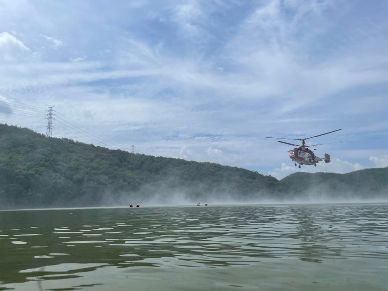 이번 훈련은 하천과 계곡을 찾은 피서객이 물놀이 중 수난사고를 당하는 상황을 가정, 소방헬기를 이용한 인명구조 활동과 현장대응능력 향상을 위해 마련됐다.